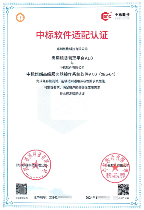 我司房屋租賃管理平臺完成麒麟系統適配認證